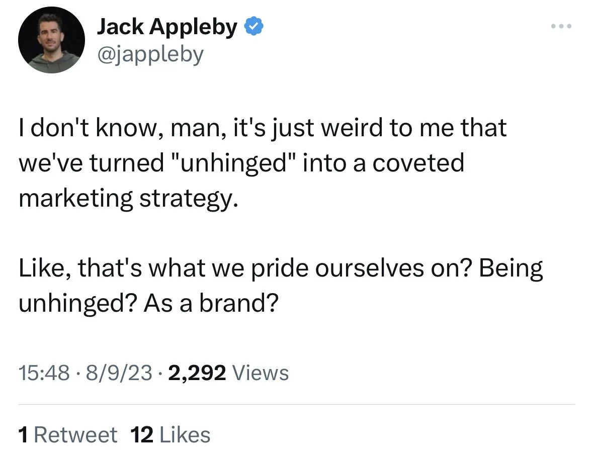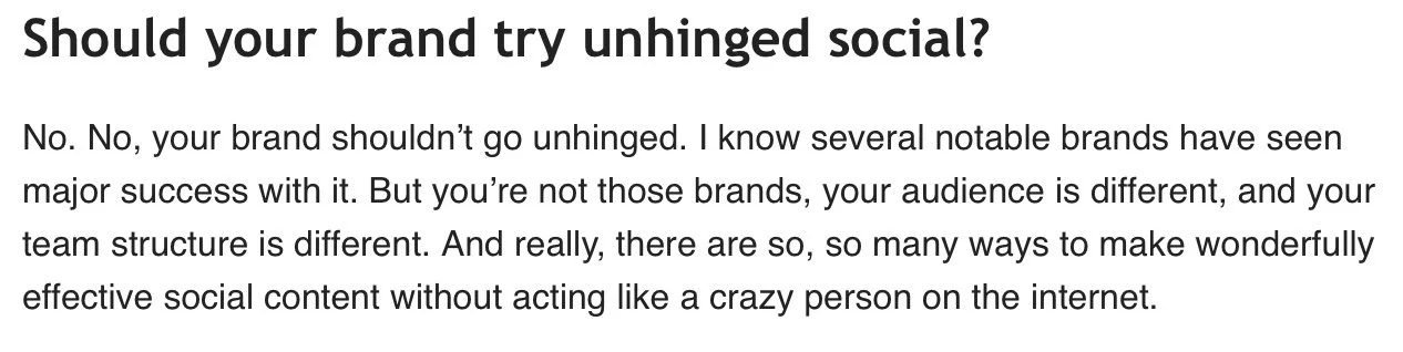 How can you say that unhinged marketing works for some but that no one should try it?! Illogical.