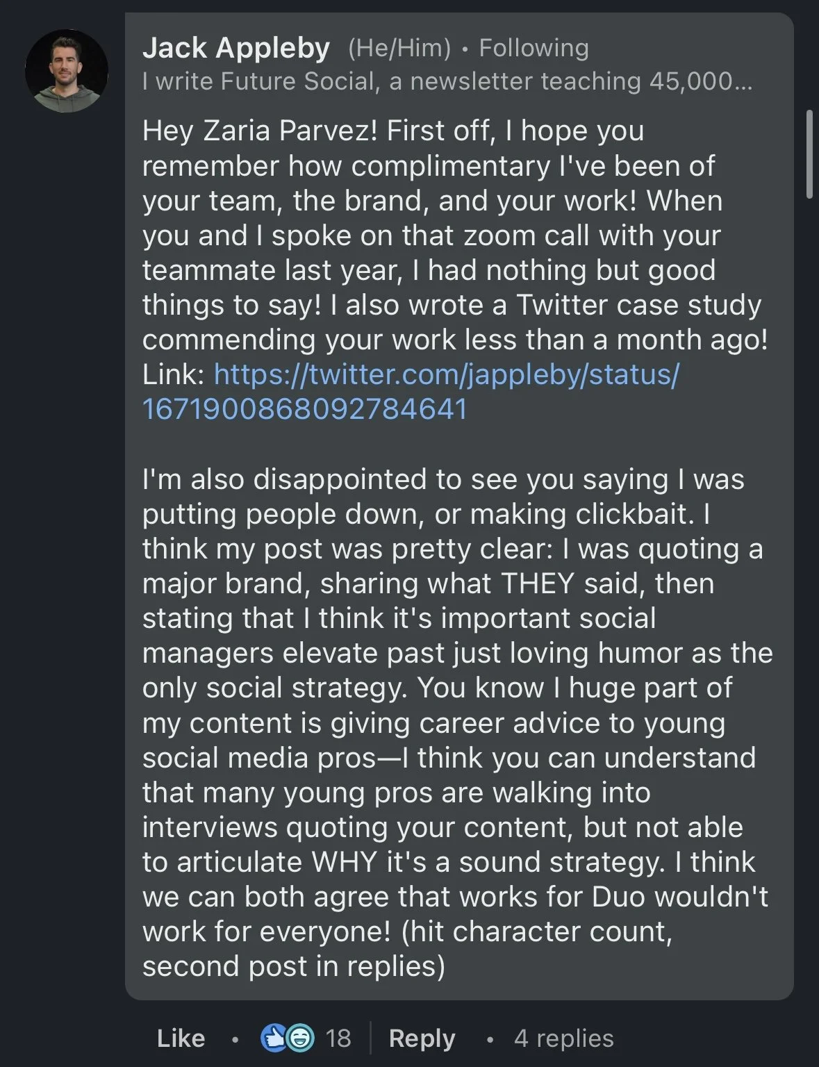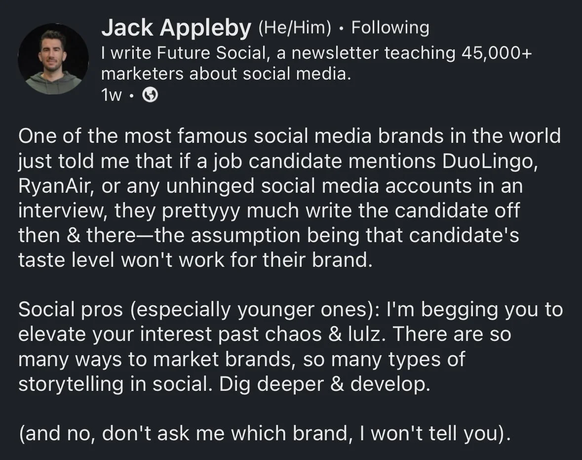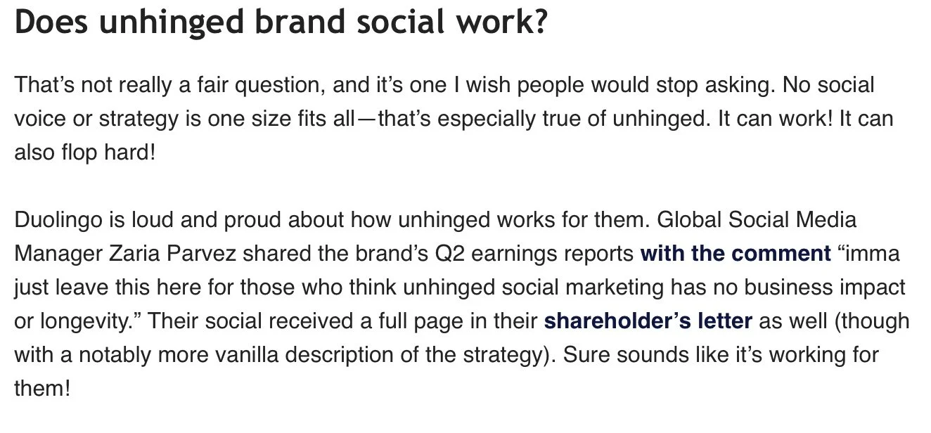 When he mentions Duolingo, Jack says: “No social voice or strategy is one size fits all—that’s especially true of unhinged. It can work! It can also flop hard!” and “Sure sounds like it’s working for them!”