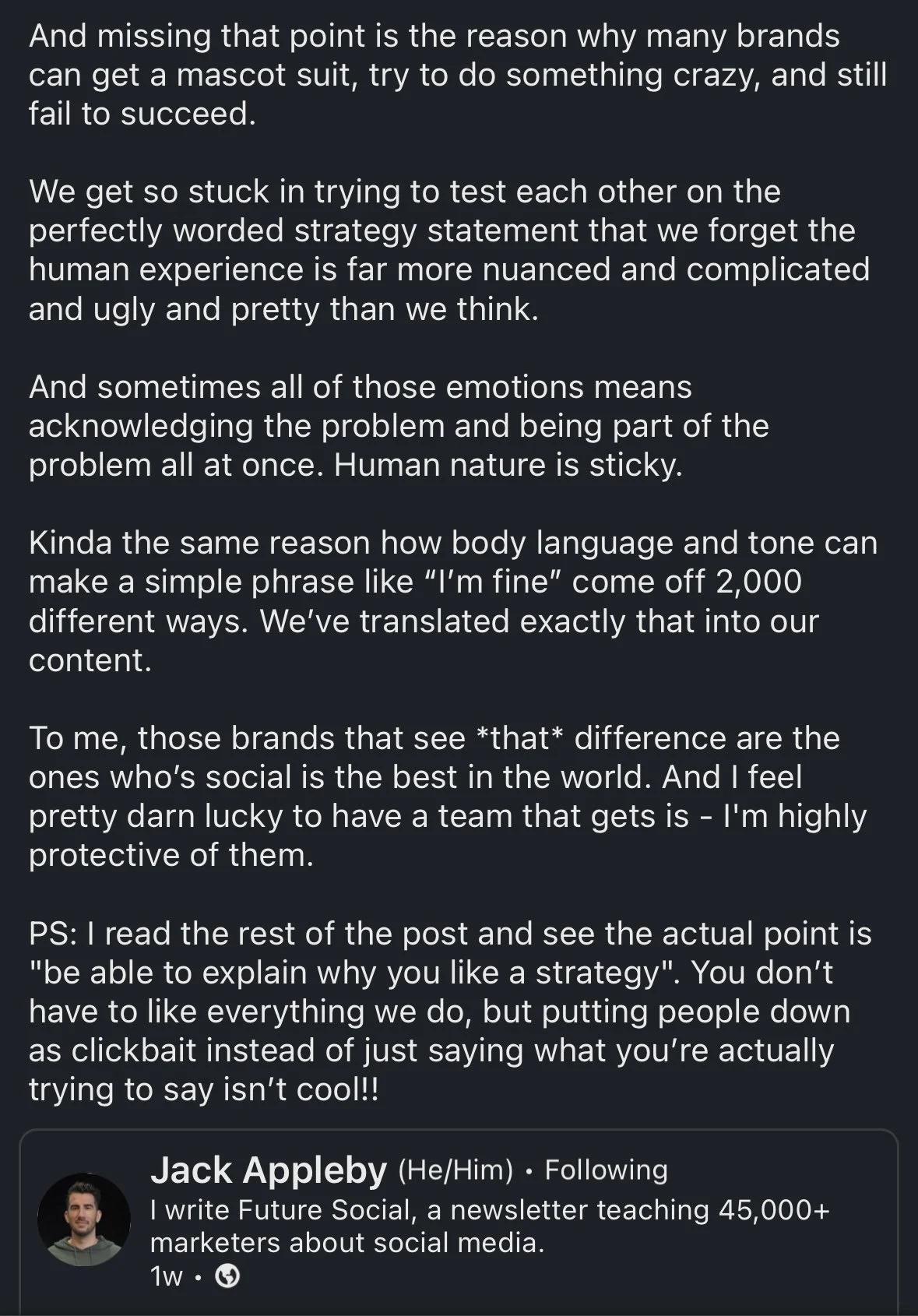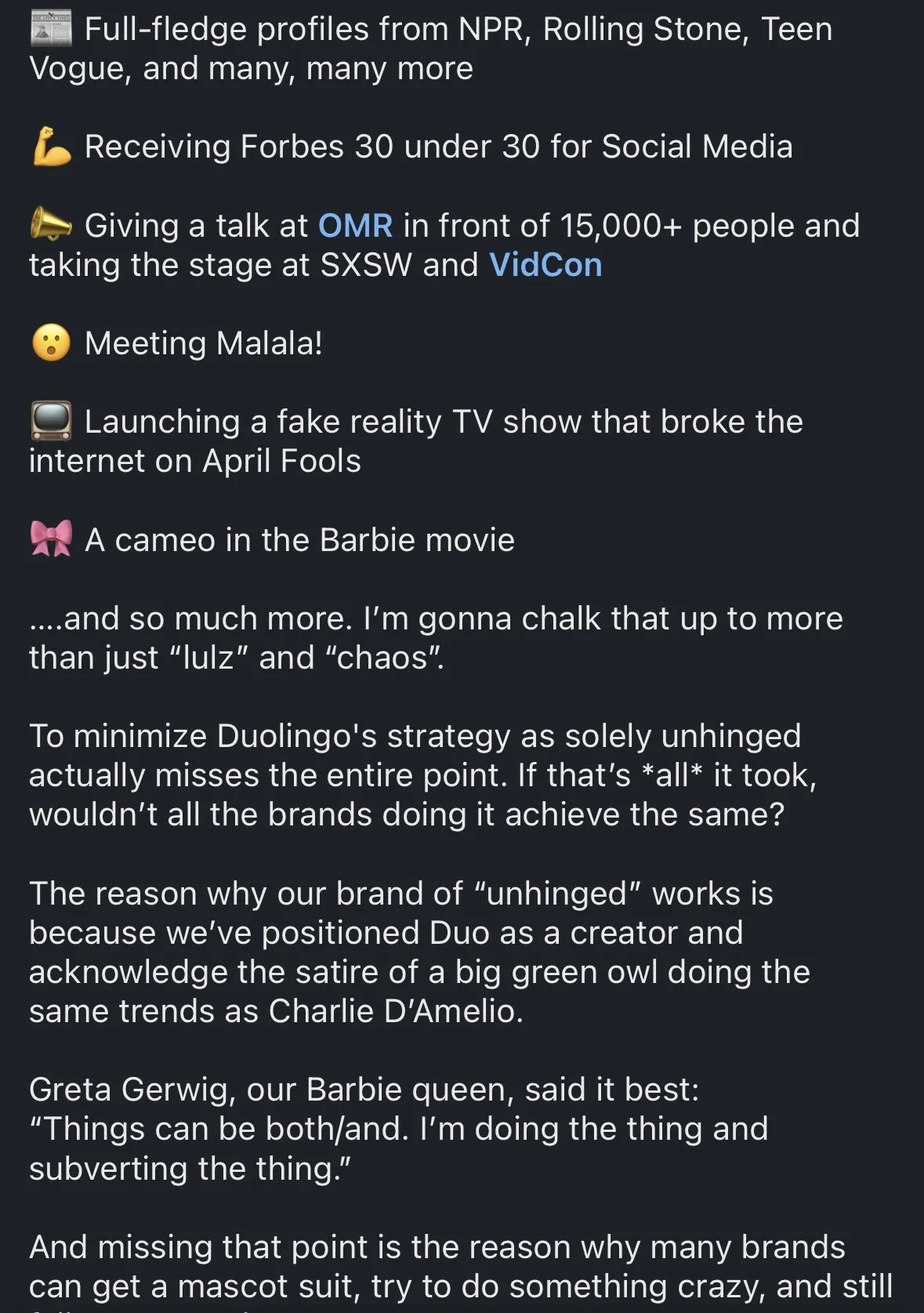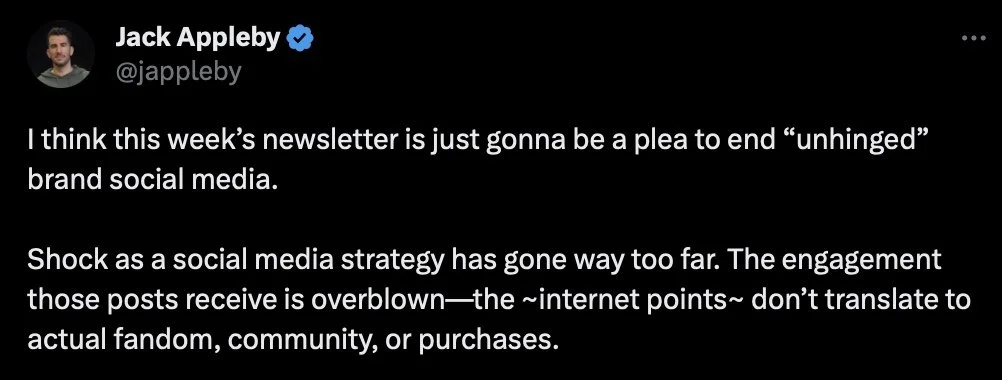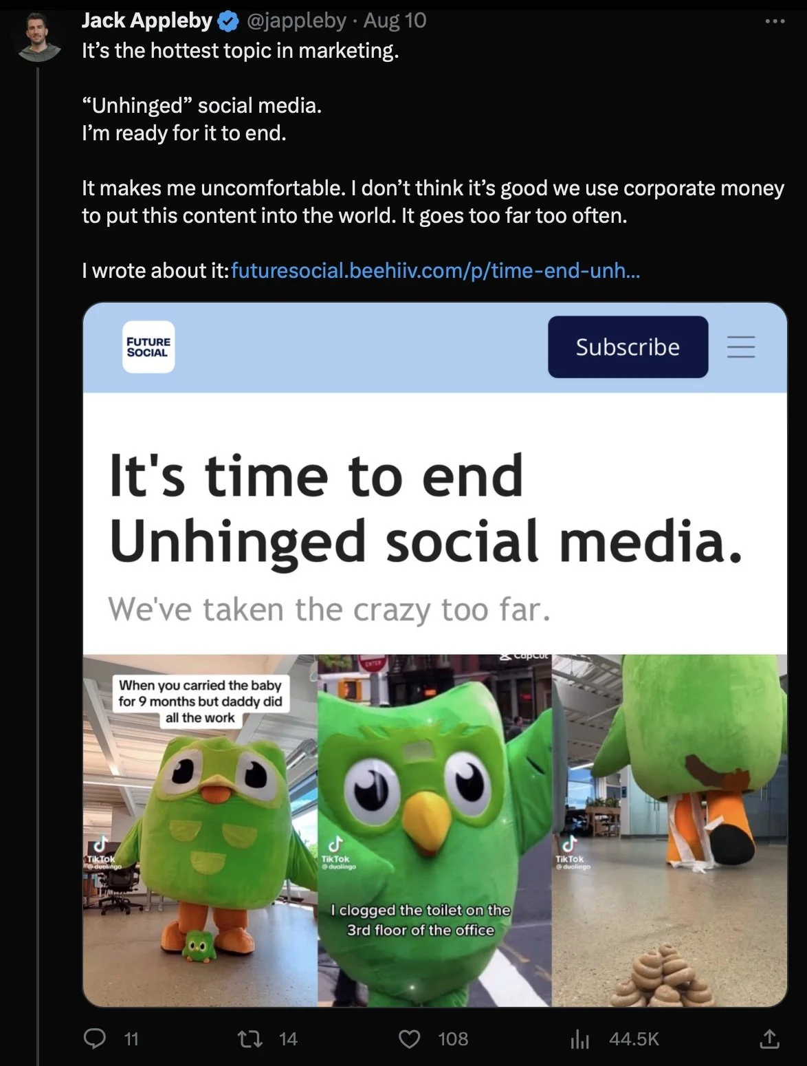 When he mentions Duolingo, Jack says: “No social voice or strategy is one size fits all—that’s especially true of unhinged. It can work! It can also flop hard!” and “Sure sounds like it’s working for them!”