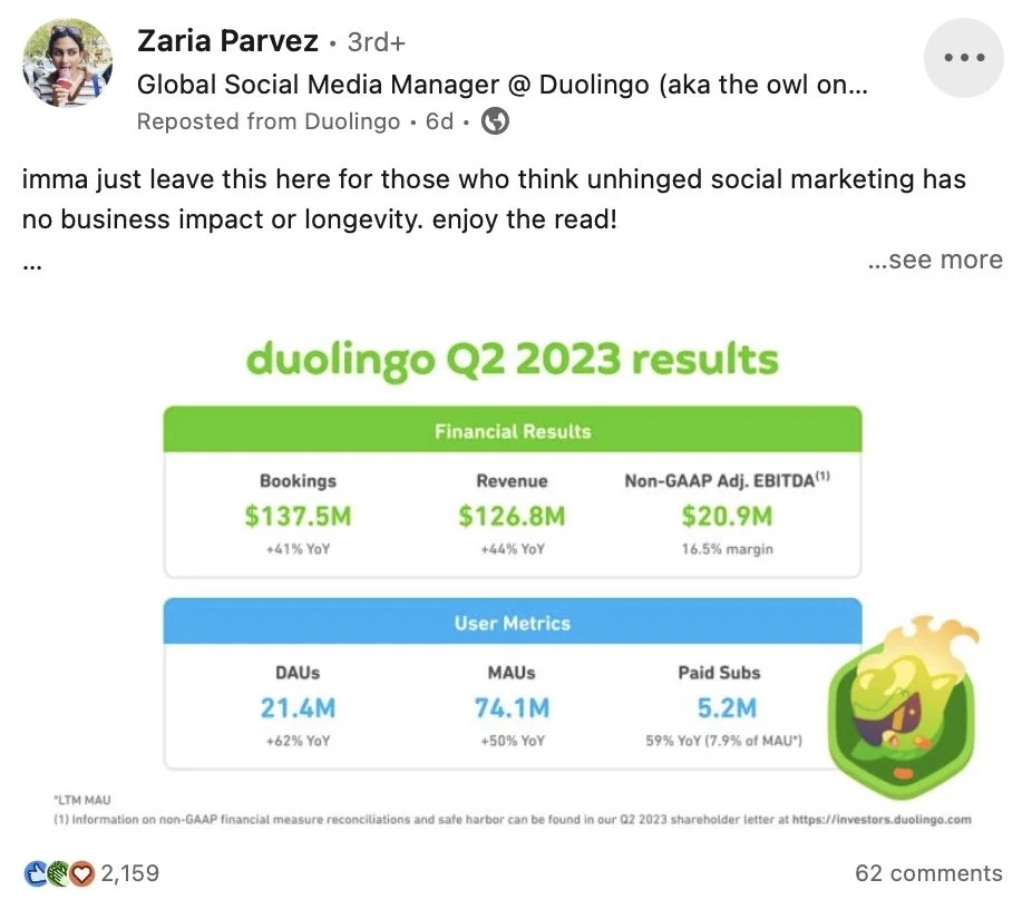 It wasn’t until Zaria Parvez posted Duolingo’s Q2 Shareholder Report that we heard anything else: